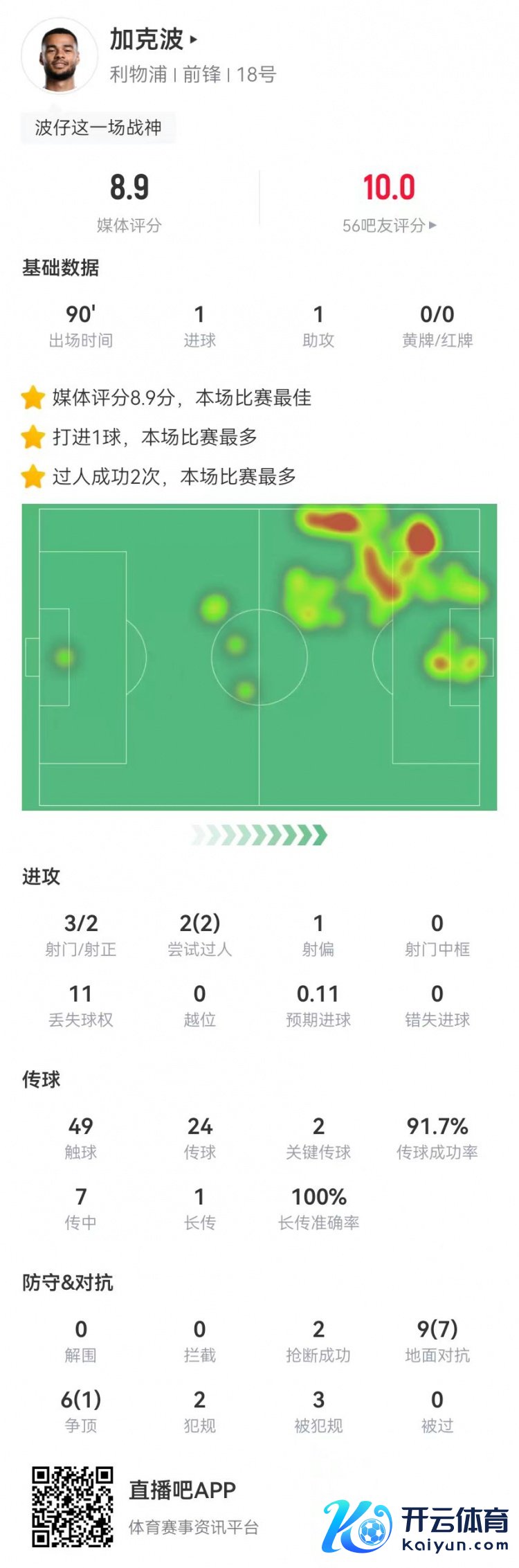12月27日讯 利物浦在本轮英超3-1打败莱斯特城,加克波本场数据如下: