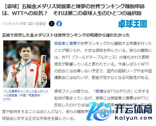 北京时候 1 月 1 日,日媒《桌球王国》发文温煦了樊振东、陈梦挣扎 WTT 措施被逼退出全国名次一事。这家日本专科乒乓球媒体报谈称,有据说说樊振东有望与欧洲俱乐部签约,今后在欧洲打联赛。2021 年东京奥运会后,羽毛球男单奥运冠军安赛龙自作派别,在迪拜树立查察营召集全国羽坛优秀男单好手一齐查察。樊振东要是果真到欧洲永远打联赛,对欧洲男单水平的提高客不雅上将起到提高作用。
