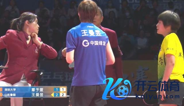 第四局比赛出现了小插曲,在第三个球的时候,王曼昱以为覃予萱击球前乒乓球仍是第二次落地,中止了比赛。裁判一启动判罚王曼昱得分。可是慢镜头长远,覃予萱的回球是好球。临了历程接洽,这个球取消,两边如故 1 比 1。