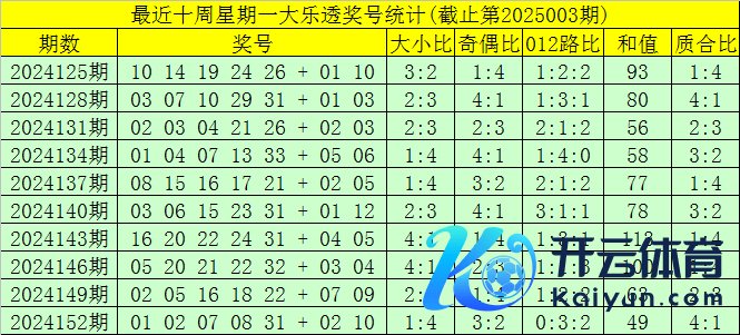 第2025003期大透乐星期一奖号分析: