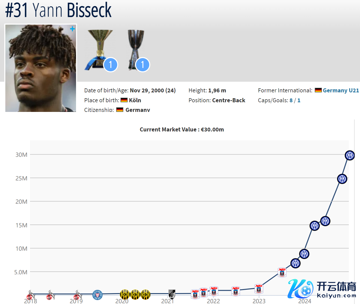 日前,《转会市集》网站更新了国米诸将的最新估价。